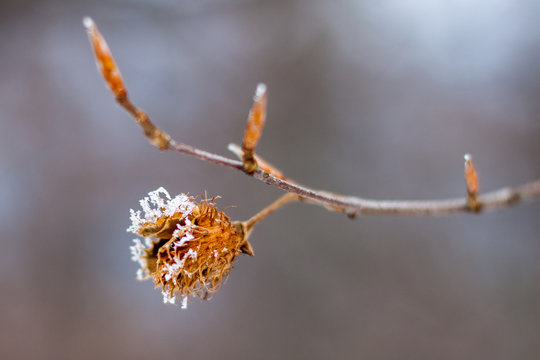 Snow covered beechnut spiky shell on a branch, zoomed in macro view, on a blurred background, during Winter
