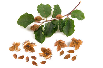 Served beechnuts, also in fruit cups with copper beech leaves (Fagus sylvatica). Edible autumn fruits isolated against a white background.