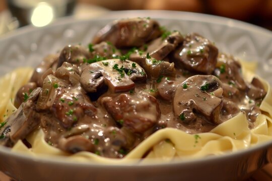A hearty bowl of beef stroganoff, featuring sautéed beef strips in a creamy mushroom sauce, served over buttered noodles.