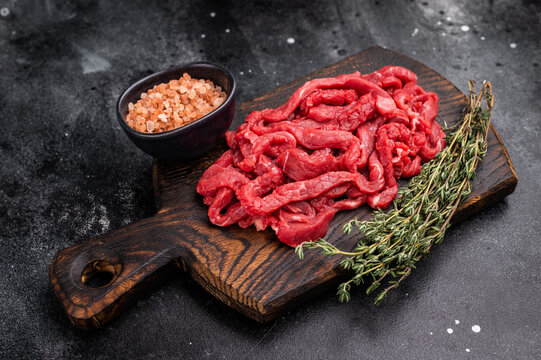 Beef Stroganoff made of beef fillet strips, sliced mushrooms, wide egg noodles, flour, beef broth, tomato paste, sour cream, Dijon mustard, Fresh parsley for garnish, top down view, clean background