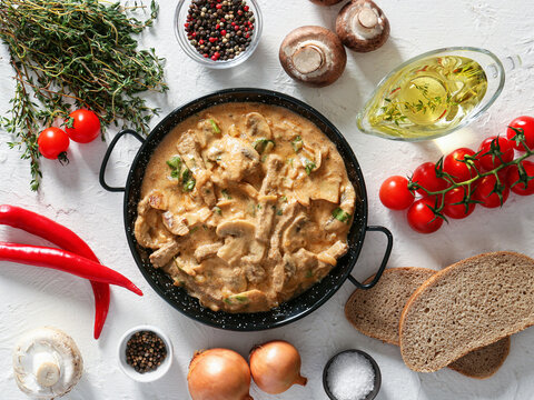 Delicious beef stroganoff with tender veal strips stewed with porcini mushrooms in creamy sour cream sauce, garnished with finely chopped parsley, served in a skillet.