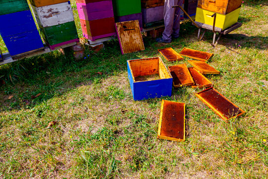 Scattered frames with honeycomb from the hives on the grass, beekeeper is packing them in the box