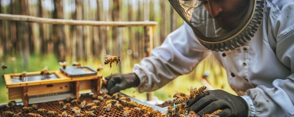 Beekeeper working with a hive, inspecting honeycomb frames in a natural outdoor setting. Beekeeping and honey production concept.