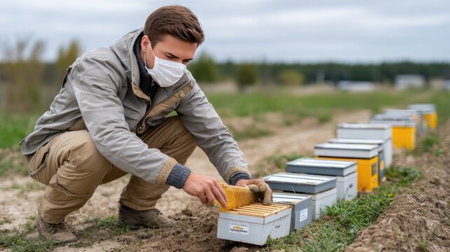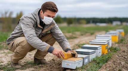Beekeeper inspecting hives in lush green field