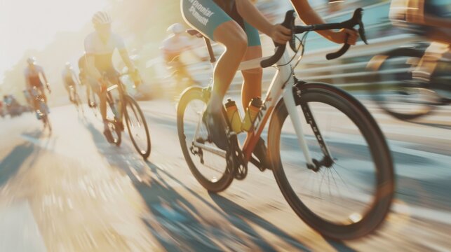 Competitive cyclists race under a warm sun, the blur of their movement capturing the speed and intensity of the event.