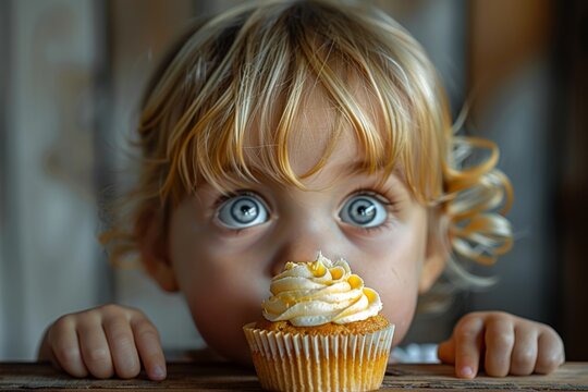 a child's eyes peeking over the edge of a table Grandma's kitchen one single cupcake, beeline eyes for cupcake, toddler wants the cupcake, eyes and top of head only