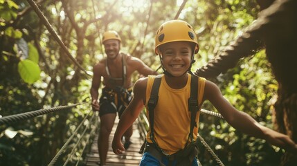 Father and son enjoying an adventurous day wearing helmets and harnesses on a suspension bridge in a lush forest.