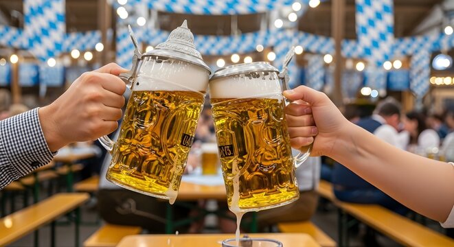 Isolated beer mugs cheering celebrate Oktoberfest, toast of clinking glass, ale, party, pub
