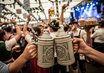 Close-up of two hands clinking beer steins filled with golden lager, warm lighting, festive bokeh background in a pub.