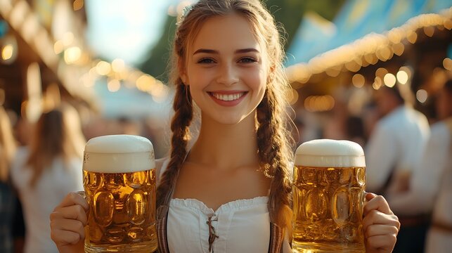 Smiling Woman in Dirndl Holding Two Large Beer Steins at Festive Market