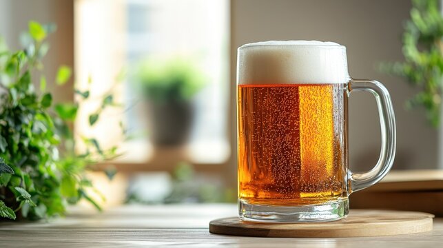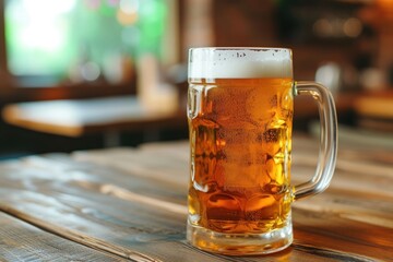 Frosty beer mug with condensation showcasing golden lager in casual bar atmosphere