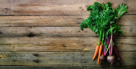 Bunch of organic freshly harvested beetroot and carrot with soil and leaves, top view. Copyspace. Concept of diet, raw, vegetarian meal. Farm, rustic and country style. Banner
