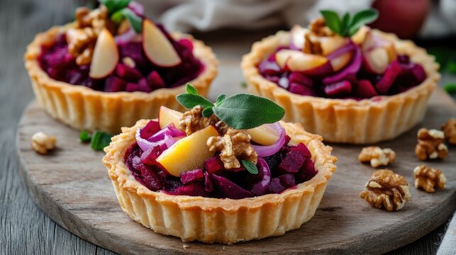 Tartlets filled with beet salad, pears, walnuts, and sweet onions garnished with fresh herbs on a rustic wooden surface.