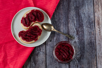 Beetroot Caraway and Horseradish Relish in Glass Jar with Dark Red Color and Neutral Background for Text Placement