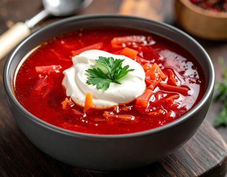 A vibrant bowl of borscht with a dollop of cream and parsley, on a rustic wooden board