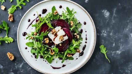 A beautifully plated beetroot and goat cheese salad with arugula, walnuts, and a balsamic glaze