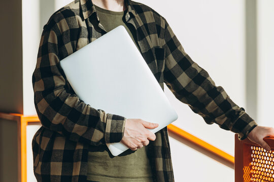 A man with a closed laptop in the office in the morning. An IT specialist came to the office in the morning. The begining of the work day.