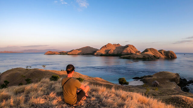 A man standing on top of a small island, facing a rising sun over Komodo National Park, Flores, Indonesia. Golden hour over the islands and sea. Some boats anchored to the bay. New day begining