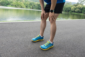 Sport practice outdoors. Young slender woman in sportswear having break while training and running outside in the evening