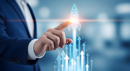 Businessman initiating a rocket launch symbolizing business growth and innovation, reaching for success with upward trending arrows and bright light