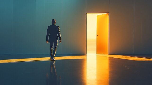 Businessman walks towards open door, sunset, opportunity