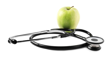 Ripe apple and stethoscope isolated on white