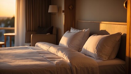 Luxury hotel room with soft beige bedding and fluffy pillows, illuminated by warm evening light, creating a cozy and inviting atmosphere.