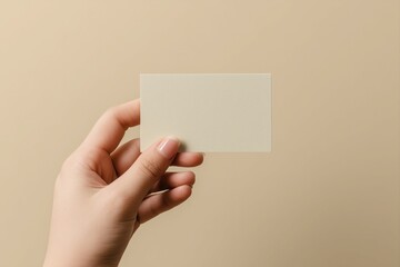 A hand holding an empty business card, on a beige background, in a minimalistic, clean, and modern style.