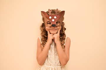 Little cute girl in a carnival masquerade deer mask made of shiny glitter foamiran on a beige background. Happy child in deer costume. The child is preparing for the masquerade.