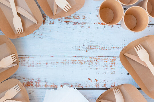 Craft tableware. Disposable tableware made from environmentally friendly materials. Composition of paper plates, glasses, knives, forks, napkins. Picnic set. View from above.