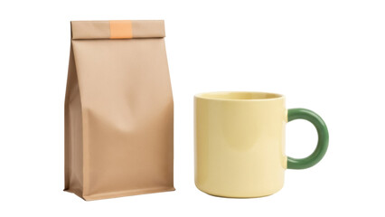 Beige coffee bag and yellow mug with green handle isolated PNG, coffee packaging mockup for branding and product presentation