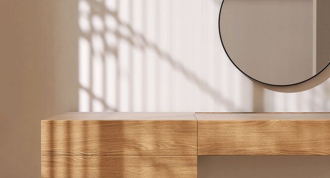 Minimal wooden dressing table, round black steel frame vanity mirror in sunlight on beige wallpaper wall bedroom for luxury fashion, beauty, cosmetic, skincare, body care product background 3D