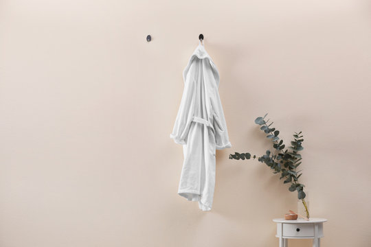 Soft comfortable bathrobe hanging on beige wall indoors, space for text