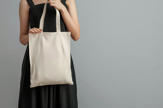 Woman in a black dress holding a fabric shopper bag on a gray background. Generative AI