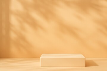 Bright serene studio setting with a rectangular podium and subtle shadows cast on a smooth beige surface perfect for showcasing products podium mockup background