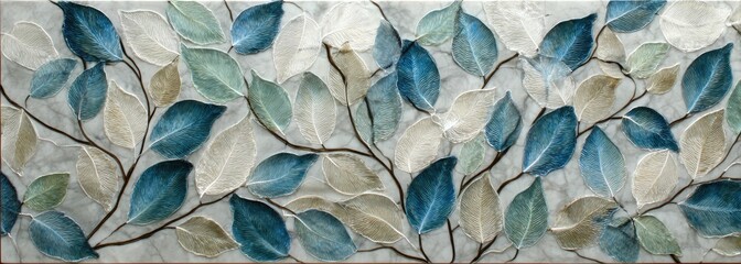 A decorative wall art piece featuring a multitude of leaves in various shades of blue, beige, and grey, arranged on delicate-looking branches