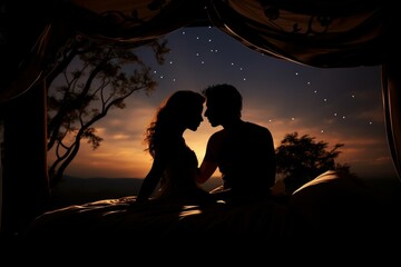 Silhouette of couple in bed at night time with stars. Pleasure sexual intimate area lifestyle. Generate Ai