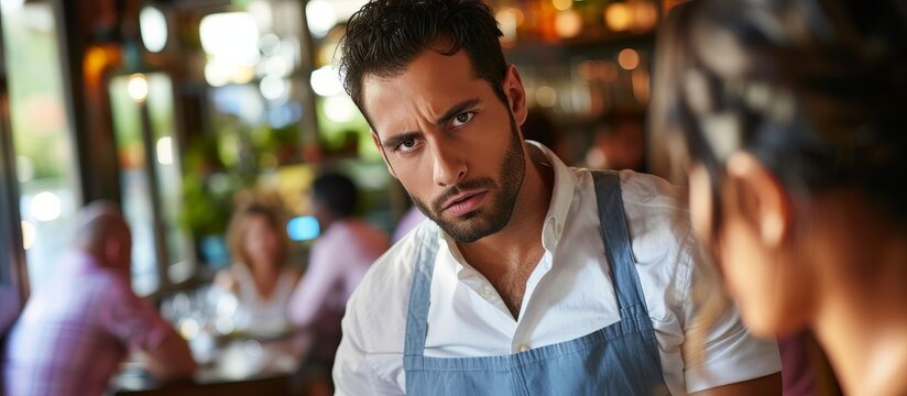 Boyfriend being unfaithful by ogling waiter's chest in front of ashamed girlfriend.