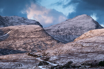 First light on Beinn an Eoin and Sgorr Tuath in winter above the Drumrunie Road, Assynt, Assynt-Coigach National Scenic Area, Sutherland, Scottish Highlands, Scotland, United Kingdom, Europe