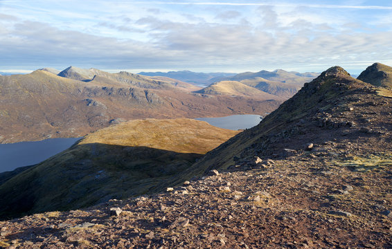 The rocky ridge leading to Sgurr an Tuill Bhain with Meall Daimh below and to the left along with ochan Fada in the Scottish Highlands.