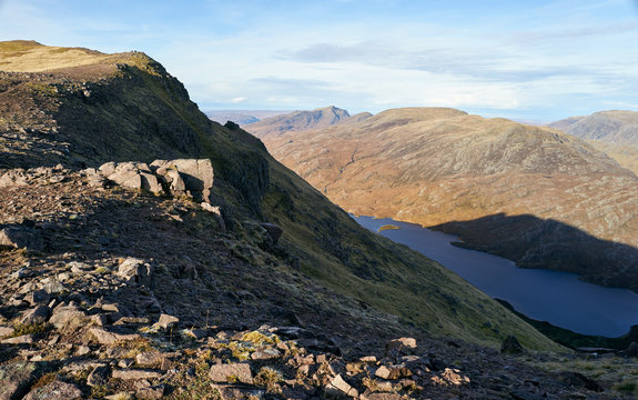 Steep sides of the ridge that leads to Sgurr an Tuill Bhain with Lochan Fada below in the Scottish Highlands.
