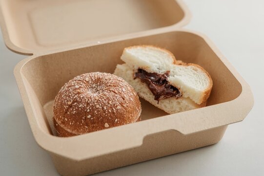 Creamy chocolate-filled white bread paired with a caramelized topping for an easy snack container. Preschool meal box. Focused detail with slight graininess.