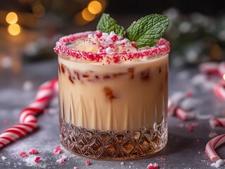 Peppermint White Russian with crushed candy cane rim and mint leaves, served in a short glass with ice cubes