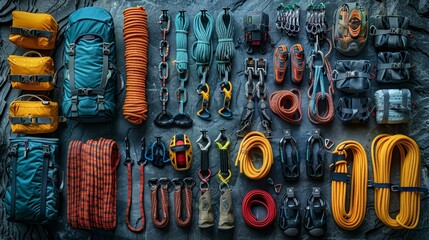 Assortment of climbing and safety hardware including ascenders, pulleys, carabiners, and rope clamps on a blue perforated surface – Climbing, Safety Equipment.