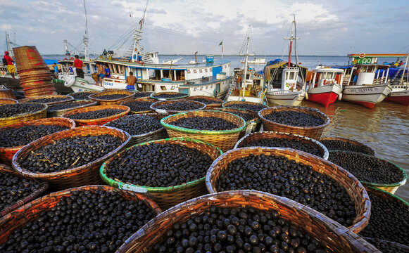 Belem / Brazil - May 14,2013. View of fishing harbor in Belem, many colorful fishing boats and rich building in background