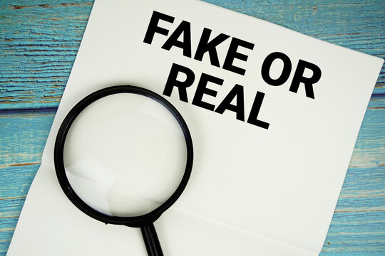 Fake Or Real text written on notepad with magnifying glass flat lay on wooden background