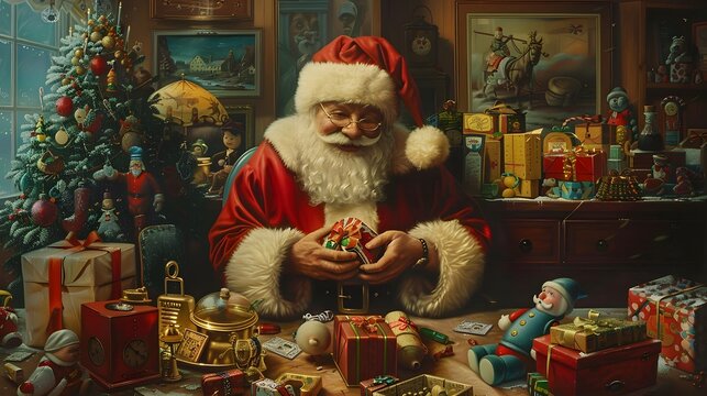 Santa's Workshop: A vintage-inspired illustration of Santa Claus in his workshop, surrounded by toys, presents, and the magic of Christmas.