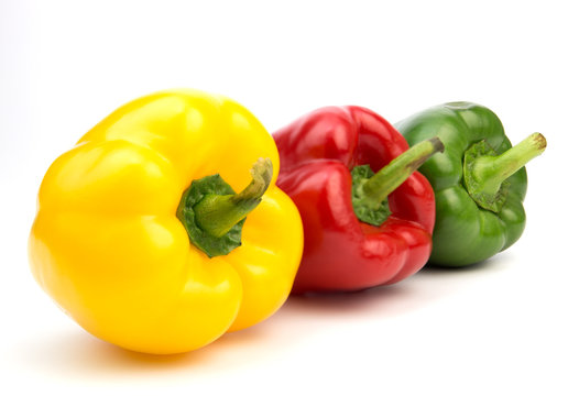 Red, yellow, green peppers on white background.