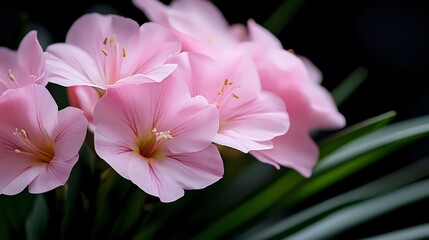 Delicate pink belladonna lily flowers in bloom against dark background, with soft petals and prominent stamens creating romantic floral composition.