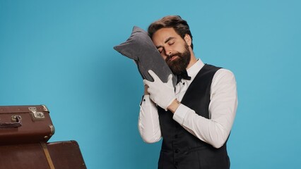 Sleepy bellman posing with pillow in studio, advertising burnout and being overworked in classy hospital industry. Hotel porter taking quick nap after working overtime, tired doorman.
